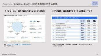いくつか事例を紹介したいと思う。経済情報プラットフォームのSPEEDAなどの事業展開をしているユーザベースは、決算説明会資料の中で、OpenWorkのクチコミランキングについて掲載している。ユーザベース社が力を入れている「多様な才能が最大限に発揮される環境づくりへの活動」の評価の一指標として開示している。