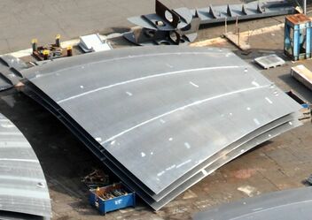 このさやえんどうの豆は、工場内では“はなびら”と呼ばれるパーツを、まずは地上で北半球、南半球、それに赤道あたりの胴体の3つに溶接加工し、ドックへ運んで組み、球とする。