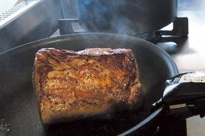 なるべく肉を動かさず、強火で30秒~1分間ずつ全面にきれいに焼き色をつける。煙が出すぎたら、ときどき火からフライパンを離すとよい。