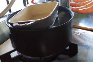 6.大きめの鍋に(5)がかぶるくらいの湯を沸騰させ、(5)を入れる。肉が浮いて湯から出ないように、皿などで重しをする。