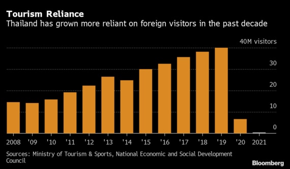 タイの観光業はコロナのパンデミック(世界的大流行)前に国内総生産(GDP)の約20%を占めていた。これは世界平均の約2倍。プーケットでは観光業が経済・雇用に占める割合が90%を超えている。ビーチに人影はなく、多くのレストランやバー、マッサージパーラーが閉鎖されているため、今年の平均所得は貧困ラインを下回る見通し。