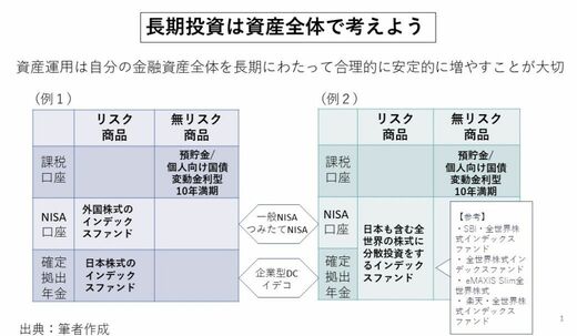 投資の考え方はさまざまですが、仕事が忙しくて手間のかかることをしたくないという斉藤さんに、「資産全体でリスクを分散させること」を伝えました。iDeCoやつみたてNISAの中でそれぞれ分散投資をしなくても、図表のように、資産全体で分散するのです。保有する投資信託を最小限にすることができます。