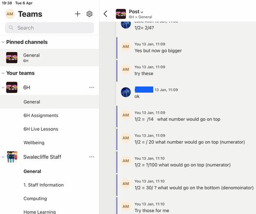 午前9時から20分間と1日の終わりの30分間は、自宅学習の生徒向けのための質問時間です。ただ、生徒はわからないことがあると、その都度、私にメッセージを送ってくる。学校はMicrosoft Teamsを導入していて、リアルタイムでやりとりできますが、分数の質問に対しメッセージだけで教えるのは本当に大変でした。