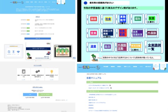 6月に大幅にリニューアルされた「GIGAサポートWEB」(左)。カテゴリーは大きく「学校支援課、職員研修、事例紹介、各種マニュアル、リンク、お問い合わせ」の6つ。「事例紹介」には教科別の授業例や情報活用能力を高めるための授業づくりの要点がわかりやすくまとまっている(右上)。「各種マニュアル」にはiPad端末や「ロイロノート・スクール」「Gsuite」「ミライシード ドリルパーク」など、さまざまなマニュアルが掲載されている