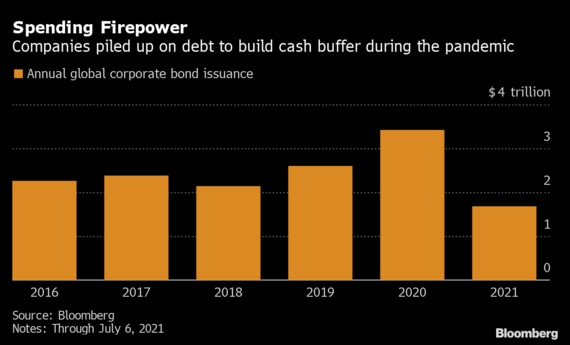コロナ感染拡大阻止で政府が経済活動を幅広く制限したのに伴い、企業は流動性リスクへの対応で20年に新規債務を大幅に増やした。これまでのところ資金繰りはうまくいき、今年に入ってからは債務がほとんど増えていない。このため、経済がコロナ禍から脱却する中で企業は手元資金を自由に使える状況だ。