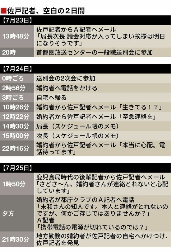 気になるのは7月24日の「局長」「次長」への挨拶回りだ。翌週、横浜放送局への異動が決まっていた佐戸記者。都庁クラブに残るA記者に、自身が担当していた都庁幹部を紹介しようとしていたのではないだろうか。