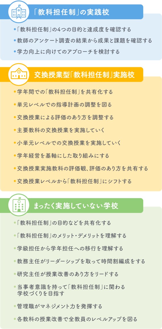 まず、教科担任制の目的の学校全体での共有を進め、教員全員が当事者意識を持てるようにすること。児童の学力向上のためには、教科担任する科目の教材研究を深化させるとともに授業改善も行い、学力変化の検証の仕方を考えなければならない。また、児童の多面的理解のためには、1人の教員による学級経営から、学年の教員チームで指導する学年経営へ意識を変える必要があり、その効果や反省点を記録し、改善できるようにすること。中1ギャップ解消は教科担任制への児童の反応、適応困難が生じないかを把握する、とした。また、教科担任制実施に向けた業務が教務主任に過度に集中しないよう、学校全体で取り組むという意識を高める必要もある。