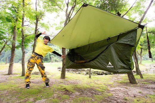 そのほかソロキャンプに行くのであれば、テントやハンモックにもこだわりたいものです。私が愛用する「ヘブンテント」というハンモックテントは、中にエアマットが敷けるようになっていて、木に張って寝転がってもV字型に曲がらない構造になっています。腰が痛くなりにくいし寝返りも楽々です。普段から腰痛に悩まされている方にはもってこいのアイテムだと思います。