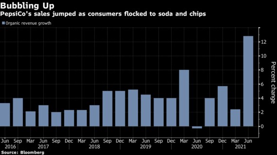 米飲食品大手ペプシコは4-6月(第2四半期)の売上高が少なくとも過去10年で最大の伸びとなり、通期の利益見通しを引き上げた。レストランやバー、スタジアムで飲食を再開する動きに支えられたほか、チップスの消費も好調だった。