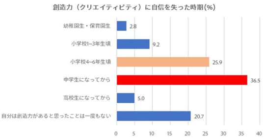 事実、アドビの「日本の高校生の創造力に関する意識調査」によれば、創造力に自信を持つのも自信を失うのも、「小学校4年生から中学3年生の間」が多い(※2)。すべての子どもたちに平等に機会を提供できる小・中学校で、創造力向上に取り組む意義は大きいとわかる。
