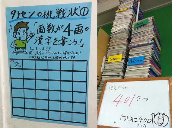 例えば、「画数が4画の漢字を書こう! ただし1人1つまで」という「タナセン(田中先生の愛称)の挑戦状」をひっそりと教室のどこかに貼っておくと、気づいた子たちがわいわいと書き始めます。そうやって挑戦状の存在にみんなが気づいた頃に「きっと4画の漢字をたくさん思いついた子もいるよね。続きは自主学習でやってみたら?」と言う。すると、みんな夢中で調べてきます。そのほか、森泉周治郎先生の実践「自学タワー」を作るなど、取り組みを可視化するのも有効です。