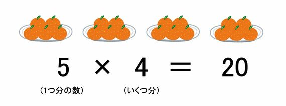 この「1あたり」と「いくつ分」は、文部科学省「【算数編】小学校学習指導要領(平成29年告示)解説」(以下、学習指導要領解説)や教科書でも出てくる表現である(「1あたり」は「1つ分の数」「1つ分の大きさ」などと表記されることが多い)。学習指導要領の解説では「1皿に5個ずつ入ったみかんの4皿分の個数」が例に出されているが、この答えを求める場合、「1つ分の数」は「5個」であり「いくつ分」は「4皿」だ。「1つ分の数」×「いくつ分」で式を構成すると、以下になる。