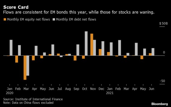 中国を除く新興国市場の債券は11カ月連続の資金純流入と、2018年前半までさかのぼる国際金融協会(IIF)のデータで最長となった。1-6月に債券が992億ドルの純流入だったのに対し、株式は22億ドルの純流出となった。