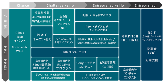 RIMIXの大きな特徴は3つある。まず1つ目が、大学だけでなく学園全体で社会起業家の育成を目指していることだ。学園内にはもともとSDGsや起業などに関するさまざまなプログラムがあるが、それらをプラットフォームとして「見える化」し、小学校から大学院まで約5万人の児童・生徒・学生に挑戦の機会を提供している。これにより、彼らの社会課題に対する問題意識を深め、起業までをシームレスに支援していく。