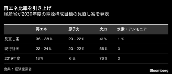 経済産業省は21日、2030年度の発電電力量に占める再生可能エネルギーの割合を約36-38%とし、現行の22-24%との目標から大幅に引き上げる案を示した。
