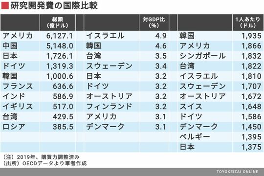 本来は研究開発費を生産年齢人口や就業者数で割って比較するべきですが、残念ながらそのデータは揃っていません。仮にそのデータで比較すれば、労働参加率が相対的に低いアメリカの順位はさらに上がることが予想できます。