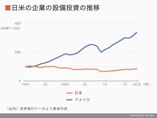日本の設備投資絶対額は1990年を100とすると、2018年には84.7まで低下しています。一方、アメリカは338.3と驚異的に増えています。