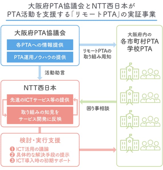 このような状況の改善を目的に、21年4月、大阪府の公立幼稚園・小学校・中学校のPTA活動を支援する大阪府PTA協議会と、ICTに強みを持つNTT西日本が共同で、ICTを活用したPTA活動を支援する「リモートPTA」の実証事業を大阪府内で始めた。