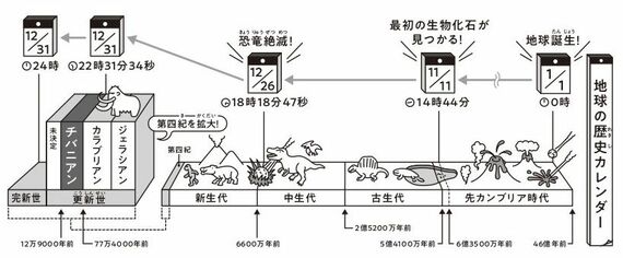みんなが好きな恐竜が隕石の衝突で絶滅したのは6600万年前。ずいぶん昔のことに思えるが、1年カレンダーだと年の瀬もおしせまった12月26日18時18分47秒。そして77万4000年前のチバニアンのはじまりは、なんと年明けまで1時間半にせまった大晦日の22時31分34秒だ。