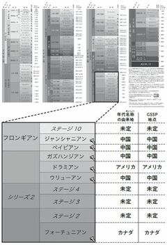 表の年代区分の境目にある金色の画鋲みたいなマークは、境目の基準であるGSSPが決まっているところを示す。国際層序委員会という学会が、世界中の科学者の研究にもとづいて認定している。