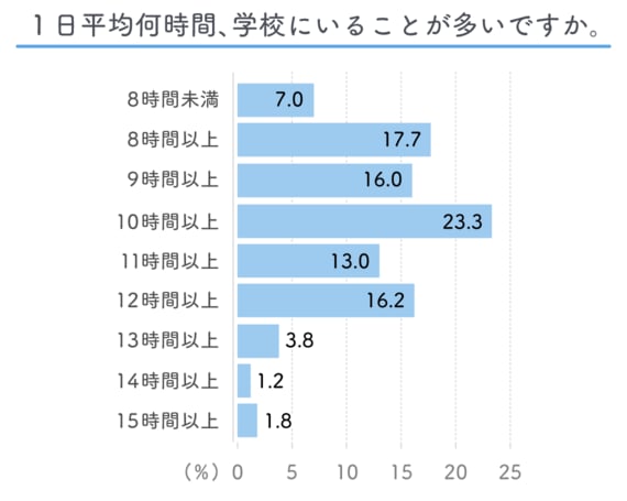 今回、学校にいる平均時間に関して聞いた質問でも、その深刻な実態は読み取れる。学校滞在時間を8時間未満から15時間以上まで1時間刻みで回答を募ったが、「8時間未満」とする回答は7.0%。「8時間以上」とする回答は全体の93.0%を占めた。最も多かった回答は「10時間以上」の23.3%で、次いで「8時間以上」が17.7%、「12時間以上」が16.2%だった。