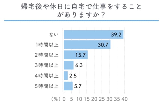 ただこれは、あくまで学校にいる時間を聞いているにすぎない。「帰宅後や休日に自宅で仕事をすることがありますか?」という質問では、「ない」とした回答が39.2%と最も多かったものの、「1時間以上」が30.7%、「2時間以上」が15.7%、「3時間以上」6.3%、「4時間以上」2.5%、「5時間以上」も5.7%の回答が寄せられた。つまり、比較的早めに帰宅している先生も、帰宅後自宅で仕事をしている可能性が考えられる。