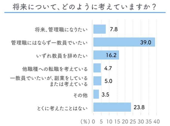 残念ながら、将来に関しての質問でも「いずれ教員を辞めたい」「他職種への転職を考えている」を合わせた回答が約21%に上っていた。