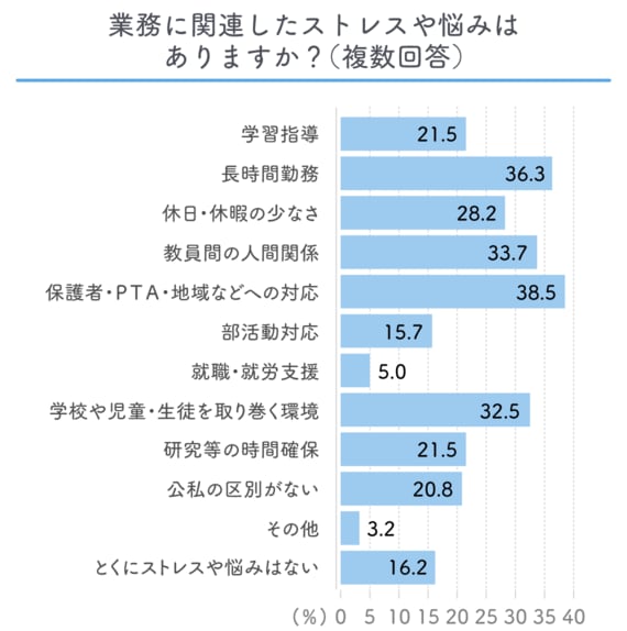 「大変なことはたくさんあるし、悩みも尽きないですが、生徒から教えてもらうことや気づかされることが多い。また頑張ろうと生徒が思わせてくれる」といった思わず胸が熱くなる意見もあった。もちろん、やりがいは感じるものの……と、その後に続く言葉も多い。「保護者との確執」や「長時間労働の辛さ」に「業務過多」などだ。次世代を担う子どもたちに「考える力」を育む教育改革は重要だが、それと同時に教員の労働環境の改善が急務なことは現場の声からも明らかである。
