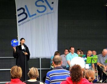 エアランゲン市では市内のスポーツクラブが芝生の広場に一同に集まり、訪問者に競技の紹介や体験をしてもらう「クラブ見本市」のようなしつらえの「スポーツフェスティバル」が行われたことがある。開催されたのが日曜日だったのだが、開会式でまず行われたのが仮設舞台での礼拝。黒い僧衣で現れた牧師、ユリア・アーノルド師は「スポーツと教会」委員のメンバーの一人だ。楽団による賛美歌が演奏され、ボールを小道具にしながら説教が進められたが、強調されたのは、「公正」「寛容」「敬意」といった価値だった。