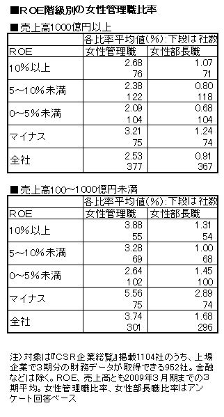 使用したデータは『CSR企業総覧』に掲載している女性管理職比率、女性部長職比率とROE。ROEは2009年3月期までの3期平均を使用した。ROE10%以上、5~10%未満、0~5%未満、マイナスの4つのグループに分け、それぞれ女性比率の平均値を集計。企業規模による差も調べるために、売上高(3期平均)1000億円以上と100~1000億円未満でそれぞれ分析した。