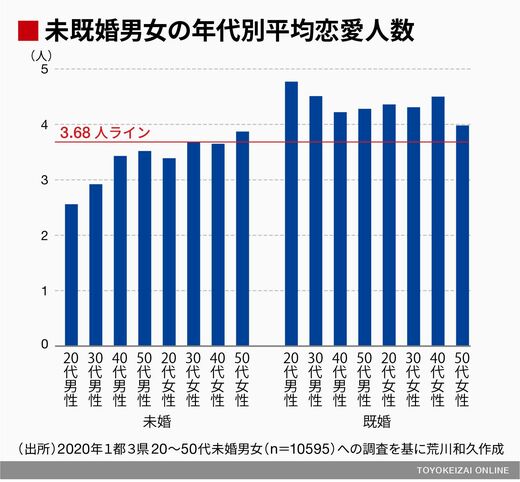 グラフにあるとおり、未婚男女の平均恋愛人数は、性別年代によって多少のばらつきはありますが、50代未婚女性以外はすべて3.68人以下です。一方、既婚男女はほぼすべて3.68人以上の恋愛人数となっています。