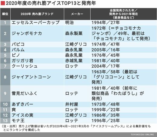 上位ブランドは、昭和・平成・令和と続くロングセラーが多い。業界の専門メディア「アイスクリームプレス」の最新売り上げランキングに、発売年を加えてみた。