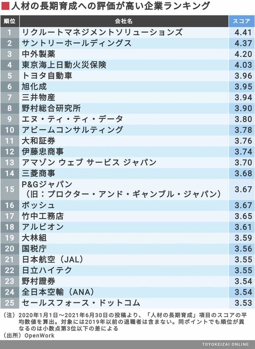 1位がリクルートマネジメントソリューションズ、2位はサントリーホールディングス、3位は中外製薬と続く。さらに4位に東京海上日動火災保険、5位にトヨタ自動車が入っている。風通しの良さランキングとは異なり、日系企業が上位にランクインする結果となった。長期雇用を前提とし、技術力が高く・多くの経験を積んだ人材が企業の競争優位性になりやすい製造業やコンサルティング・シンクタンク企業が並ぶ。