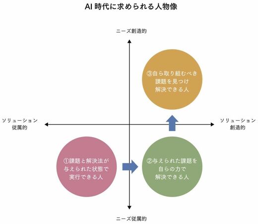これらの軸で人のタイプを分けると4つのタイプに分かれるが、AI時代に求められる人物像を理解するために、そのうちの次の3つのタイプについて特に注目したい。