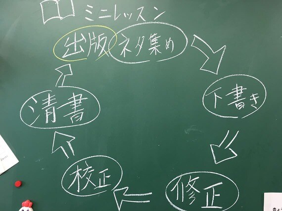 出版後の授業では、みんなで読み、まずは自分が書いたものを振り返ります。ここで自分の誤字脱字に気づく場合が多いのですが、その気づきが重要です。