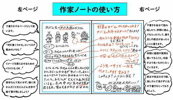 最初は書きたいテーマについて「ネタ集め」。物語なら「いつ・どこで・登場人物・出来事・終わり方」などのネタをまとめ、それを基に「下書き」をします。多くの場合は「作家ノート」を作ります。ノートは何でもいいのですが、左ページに下書きをして、右ページは自分で気づいたことのほか、教員や友達のアドバイスを書き込んでいくという使い方をします。僕は中学年以降でこのノートを取り入れています。