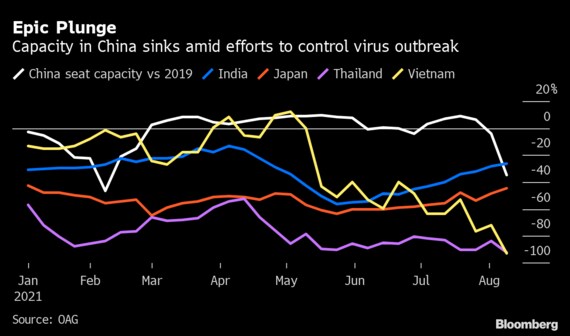 中国の航空会社が提供する座席数は1週間で32%減り、コロナ禍初期以来の大幅減となった。新たな移動制限の影響がうかがえる。航空情報会社OAGのデータが示した。中国の落ち込みに加え、欧州や北米でも旅行の回復が滞っており、世界では週間ベースで6.5%減少した。