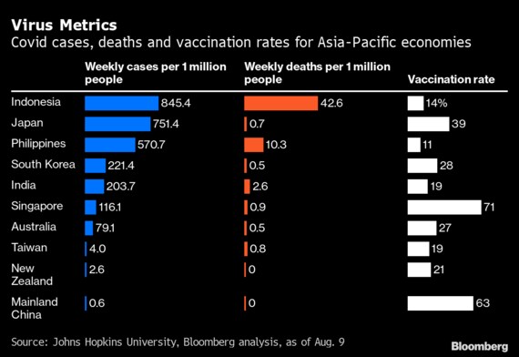 域内のワクチン接種率はばらつきが大きく、一部の人々は感染リスクにさらされたままだ。米ジョンズ・ホプキンズ大学がまとめたデータに基づくブルームバーグの試算によると、東南アジアのコロナ関連死亡率は今月に入り中南米を超え、世界最悪となった。アジアのワクチン接種進展ペースは世界でも目立って遅く、接種率は人口の14%にとどまる。これを下回るのは北アフリカとサハラ以南のアフリカだけだ。