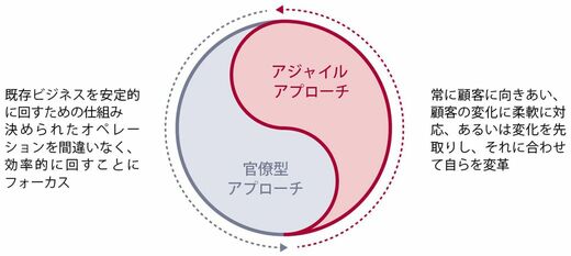 第3ステージにおいては、アジャイルの仕組み・動き方そのものが通常業務の運営へとフィードバックされてゆく必要がある。それには、アジャイルアプローチといわば官僚型アプローチの適材適所の併存が求められる。日本の企業の得意な官僚型アプローチのよさをも再認識し、それとアジャイルの仕組みとの両立が成功のカギである。
