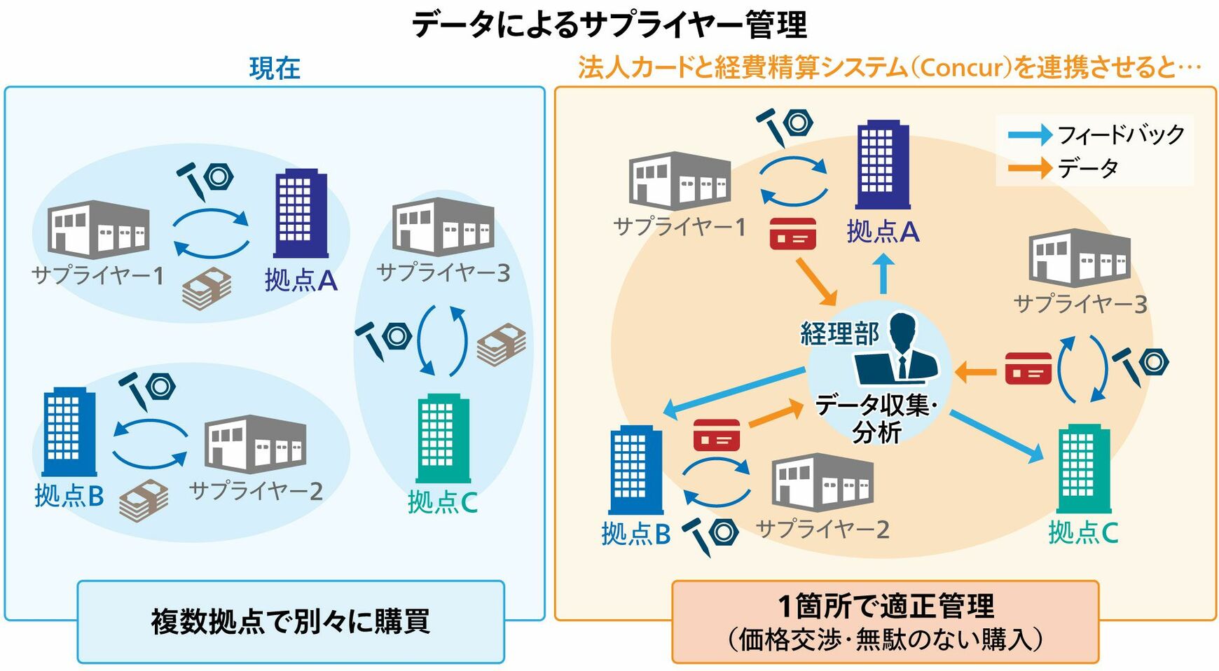 スラバ 今までにないデータ活用法として、海外ではサプライヤー管理が進みつつあります。収集したデータを分析して無駄な購買をなくす、いわば「仕入れの最適化」です。例えば東京本社と大阪支社で同じ消耗品を別々のサプライヤーから仕入れるケースは珍しくありません。でも、同一法人で仕入れをしているのに、個別契約だからボリュームディスカウントが得られないわけです。経費データの一元管理ができれば、そうした無駄を減らし、原価低減を達成することにより、最終的に企業の利益向上につながります。