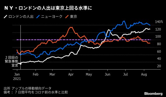 米アップルの移動傾向リポートによると、ニューヨークやロンドンの居住者の活動レベルは、日本を大きく上回る。政府は17日、感染力が強いデルタ株による感染拡大を受けて、東京都など6都府県に対する緊急事態宣言を9月12日まで延長し、京都や福岡など7府県も対象に追加した。消費者の姿勢が一段と慎重になる恐れもある。