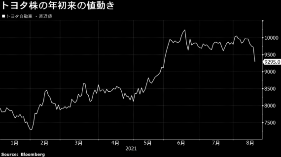 トヨタ株はこの日、前日比0.7%安で取引を開始。その後は上昇に転じる場面もあったが次第に売りが優勢となった。午後に入って下げ幅がさらに拡大し、一時前日比4.6%安の8864円まで下落して5月26日以来の日中安値となった。終値は8915円。