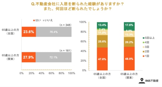 R65が、全国の「65歳以上」と「20~30代」を対象に、65歳以上が住宅難民になりやすいことについて調査をした。65歳以上に、「不動産会社に入居を断られた経験があるか」を聞くと、「はい」と回答したのは全国では23.6%で、関東圏に限ると27.9%にまで上昇した。さらに、断られた経験の回数を聞くと、「1回」という人が半数近くになるが、「5回以上」という人も13.4%(関東圏では17.6%)もいた。