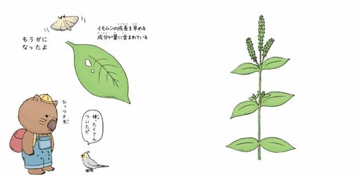 イノコヅチは、ヒユ科の多年草で、日本では北海道以外に分布しています。夏から秋にかけて緑色の地味な花を咲かせます。天敵は葉を食べるイモムシですが、イノコヅチはユニークな方法で、イモムシに対処しています。イノコヅチの葉にはイモムシの成長を早める成分が含まれていて、その葉を食べたイモムシは通常より早く脱皮を繰り返し、十分な葉を食べずに成虫のチョウやガになってしまいます。チョウやガになれば、もう葉は食べませんし、早く育った成虫は小さくなってしまい、卵を産む力がありません。こうして、イノコヅチは天敵のイモムシをやっつけているのです。