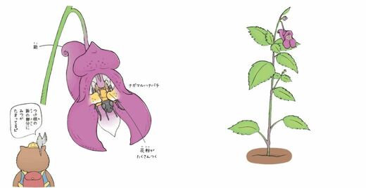 花の形が複雑で、みつのある奥の部分がうずまき状になっているので、みつにたどりつけるのは、ナガマルハナバチなどの長いストロー状の舌をもつ虫に限られます。虫がみつを飲むには、花の奥まで入りこまなければなりませんが、このときに花粉が虫の体にたくさんつくしくみです。みつの「飲み逃げ」は許さないというわけですね。