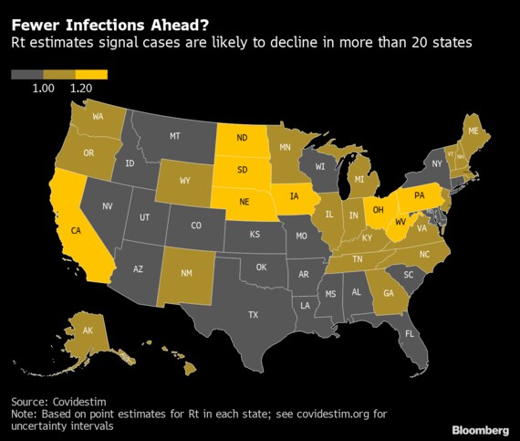 エール大学公衆衛生大学院やハーバード公衆衛生大学院、スタンフォード・メディスンが参加するモデリングプロジェクト、Covidestimによると、1人の感染者が何人に感染を広げるかを示す実効再生産数は大部分の州で減少している。実効再生産数が1未満になると症例が間もなく減少すると予想され、22州が既にその水準を下回っている。他州の大部分は1から1.2の間にあり、低下傾向にあるという。