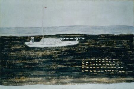 船の上で中国服の女性が髪を結い、右下には60羽のアヒルが行儀よく並んでいる。作者のサンユウ(1901~1966年)は中国の四川省に生まれ、パリで活躍した画家だ。
