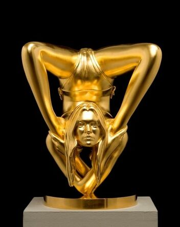 穏やかな絵とは打って変わって、不思議なポーズをとる金ピカの女性像は、イギリスのマーク・クイン(1964年~)の作品だ。東洋的なヨガのポーズと、西洋的な美の象徴であるスーパーモデルのケイト・モスの体がひとつの像になっている。