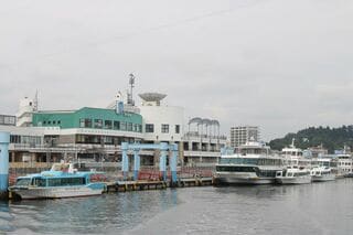 電車で本塩釜に戻り、駅横のイオンタウンからプロムナードデッキでつながっている「みなとオアシスマリンゲート塩釜」へ、5分ほど歩く。松島湾の入口部分には外松島とも呼ばれる浦戸諸島があって、湾内最大の島、宮戸島(東松島市)をはじめ湾口をふさぐような形で島々が散在している。震災時には自然の防潮堤の役割を果たしたのだろう。