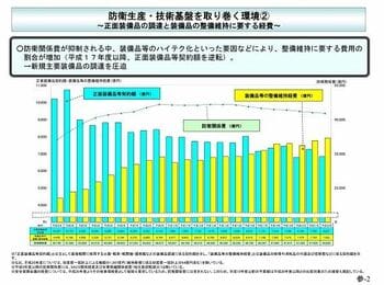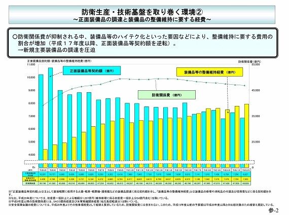 防衛予算は微減が続き、それに合わせて装備の高度化による調達単価の高騰、維持修理費の高騰などによって装備調達予算は毎年減り続けている。つまり防衛産業自体が衰退産業といえるだろう。
